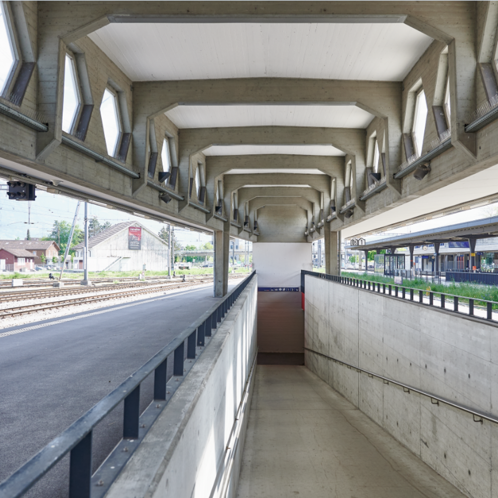 Der Grenzbahnhof Buchs sticht im Kanton St. Gallen durch seine wertvolle moderne Architektur hervor. Dazu gehört als ältestes Objekt das expressive Perrondach der Geleise 3/4 von 1956 samt Zollgebäude mit seinen an die Raumfahrt erinnernden Aluminiumeinbauten. Von Max Vogt, dem berühmtesten SBB-Arch...